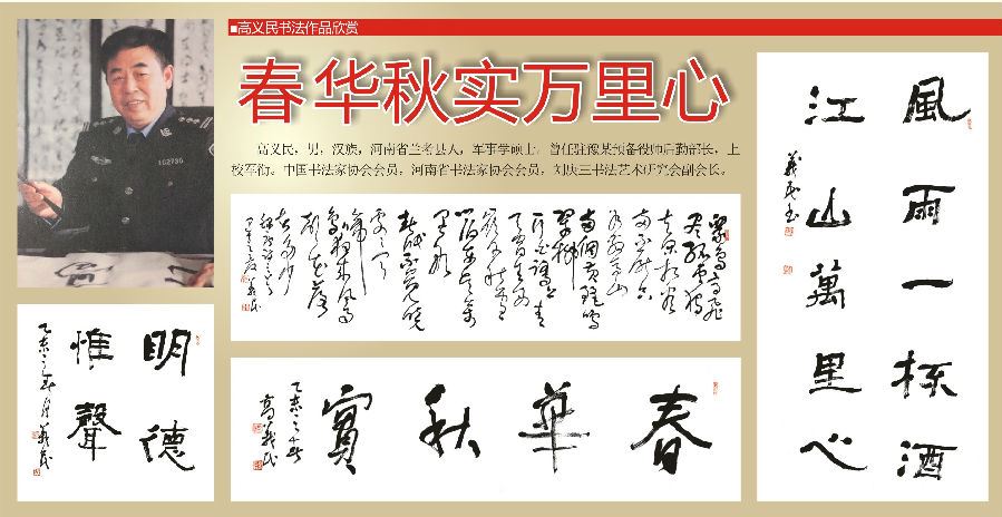 高义民,男,汉族,河南省兰考县人,军事学硕士。曾任驻豫某预备役师后勤部长,上校军衔。中国书法家协会会员,河南省书法家协会会员,刘庚三书法艺术研究会副会长。
