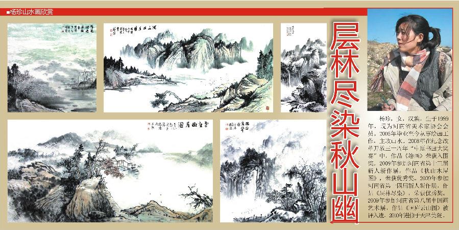 杨珍,女,汉族,生于1989 年,现为河南省美术家协会会员。2005年毕业至今从事绘画工作,主攻山水。2008年在纪念改革开放三十周年“中原书画大奖赛”中,作品《绘画》荣获入围奖。2009年参加河南省第十三届新人新作展,作品《秋山木屋图》,荣获优秀奖。2009年参加河南省第十四届新人新作展,作品《层林尽染》,荣获优秀奖。2009年参加河南省第八届中国画艺术展,作品《匡庐云山图》被评入选。2010年进修于天津美院。