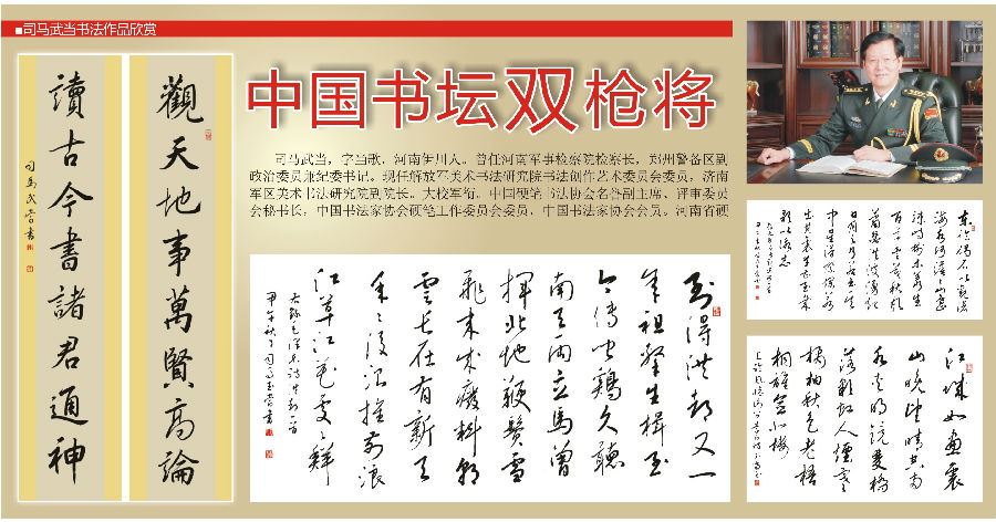 司马武当,字当歌,河南伊川人。曾任河南军事检察院检察长,郑州警备区副政治委员兼纪委书记。现任解放军美术书法研究院书法创作艺术委员会委员,济南军区美术书法研究院副院长。大校军衔。中国硬笔书法协会名誉副主席、评审委员会秘书长,中国书法家协会硬笔工作委员会委员,中国书法家协会会员。河南省硬笔书法家协会主席,河南省书法家协会副主席,河南省草书专业委员会主任。(王雷)