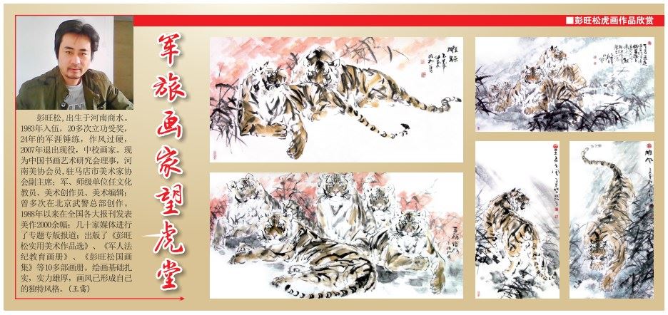 彭旺松,出生于河南商水。1983年入伍,20多次立功受奖, 24年的军涯锤练,作风过硬,2007年退出现役,中校画家。现为中国书画艺术研究会理事,河南美协会员,驻马店市美术家协会副主席;军、师级单位任文化教员、美术创作员、美术编辑;曾多次在北京武警总部创作。1988年以来在全国各大报刊发表美作2000余幅;几十家媒体进行了专题专版报道;出版了《彭旺松实用美术作品选》、《军人法纪教育画册》、《彭旺松国画集》等10多部画册。绘画基础扎实,实力雄厚,画风已形成自己的独特风格。(王雷)