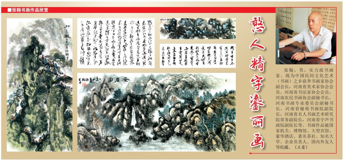 张翰,男,实力派书画家。现为中国民间文化艺术(书画)之乡庙李书画家协会副会长,河南省美术家协会会员,河南省书法家协会会员,河南农民书画协会副秘书长,河南书画专业委员会副秘书长,河南省秘苑书画院副院长,河南省名人书画艺术研究院常务副院长,河南省宇声书画院副院长等。书画作品被国家机关、博物馆、大型宾馆、豪华酒店、著名茶社、知名大学、企业负责人、国内外友人等收藏。(王雷)