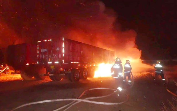 3月22日0时18分,采服中心应急抢险中心大牛地气田首站中队接到榆林红山路消防救援站转警:G210国道早留太村附近两辆半挂车起火,火势凶猛,情况危急。